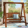 Enjoy the beautiful weather outdoors with this hardwood porch swing with stand. This swing provides space for entertaining guests or for watching the sunset with a Teak oiled finish that looks great with most decors.